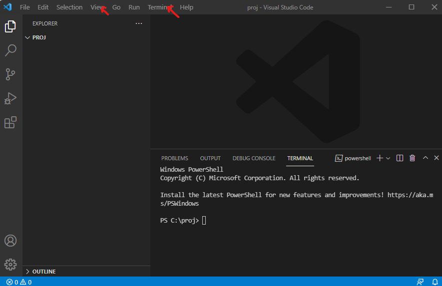 Open Visual Studio Code to an empty folder in lowercase with no spaces. Then open the “View”->”Explorer” window and the Terminal window. In this example I’m using C:\proj\